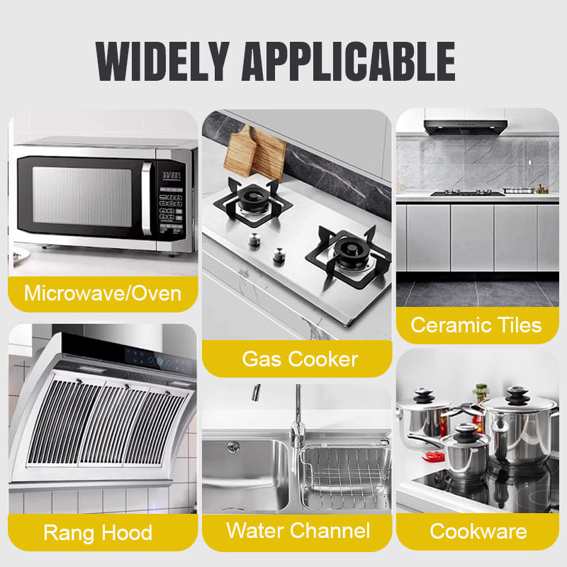 - Tough Grease Stains: Kitchen Counter, Range Hoods.