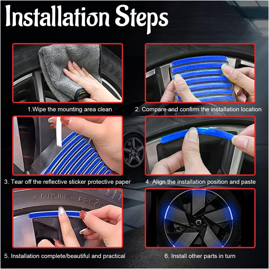 Ease of Installation: Installation is simple. You only need to clean the surface to keep it dry, take out the car stickers, tear off the cute stickers, stick on the car wheel, and press for a while to ensure that there is no air inside, it is recommended not to wash the car within 24 hours.