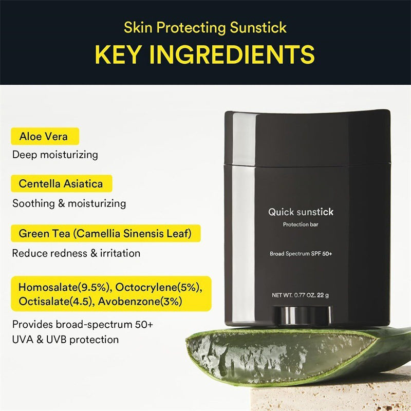 SKIN - FRIENDLY INGREDIENTS: Infused with aloe vera, centella asiatica, and green tea, this sunstick offers additional skin - benefiting properties. Aloe vera deeply moisturizes, centella asiatica soothes and hydrates, and green tea reduces redness and irritation.